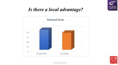 结论是本土分析师做得比海外分析师好。比如在做盈利预测的时候,本土分析师盈利预测错误的程度比海外分析师的预测结果要低。为什么他们做得好?有什么和海外分析师不一样的地方支撑他们做得更好?主要是一些对政治、政策的了解。在中国的国情下,如果不懂政治做生意是很难的,如果完全不懂政治、不懂政策,不跟着政策走,公司生存相对比较困难。中国资本市场下政治因素对企业运营起到了非常重要的作用。我们也从各个方面证明了一个现象,某个时期下,中国上市公司在信息披露上会有不一样,或许在某个阶段,公司会披露比较正面的信息,隐藏某些负面信息。