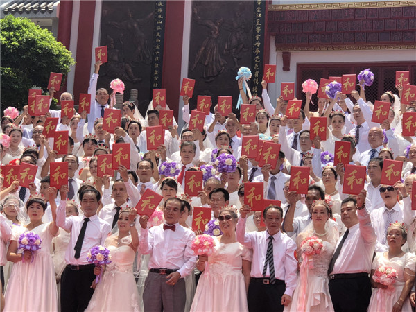 【香港商报网讯】记者程功明报道:6月16日至17日,恰逢“父亲节”和“端午节”,由中国文保会民族服饰文化艺术委员会、东莞市志愿者联合会、凤岗镇人民政府指导,广东省婚庆行业协会、东莞市婚庆行业协会联合主办的第七届“我圆爸妈婚纱梦”中老年集体婚禧活动(志愿者专场)在凤岗龙凤山庄举行。来自全国各地100对志愿者和志愿者亲属们参加了本次活动。其中金婚(50年以上)的有8对,珍珠婚蓝宝石婚(30-50年)的有35对。