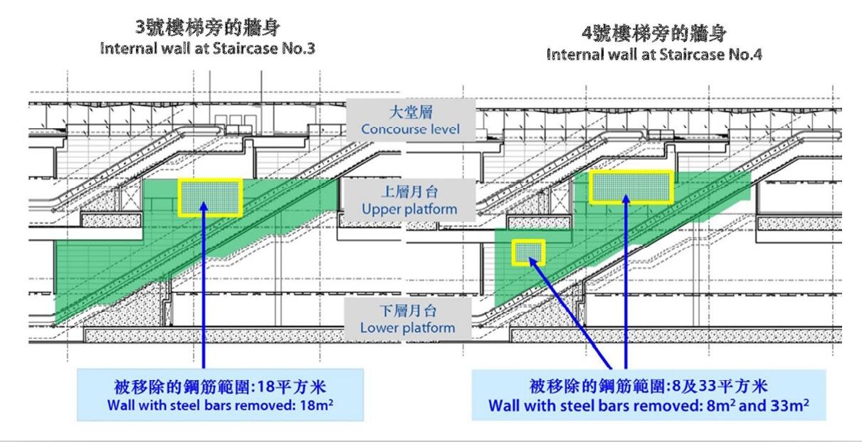 對於土瓜灣站的問題,港鐵的報告確認該站其中兩幅牆上面積共60平方米的3個位置,有鋼筋被移除,未有依照已批核的圖則。報告提及,負責鋪紙皮石的分判商,於年初發現兩幅牆的牆身鼓起,需要平整才能鋪紙皮石;而負責石屎工程的分判商,在承建商「三星新昌聯營」建議之下,在3個位置移除部分鋼筋;港鐵明言上述做法不符合程序的規定。