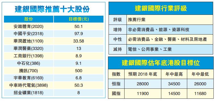建銀國際選出十大優質股,包括安踏體育(2020)、宇華教育(6169)、中石化(386)、平保(2318)、工行(1398)、華潤醫藥(3320)、中車時代(3898)、騰訊(700)、招金(1818)和潤地(1109)。