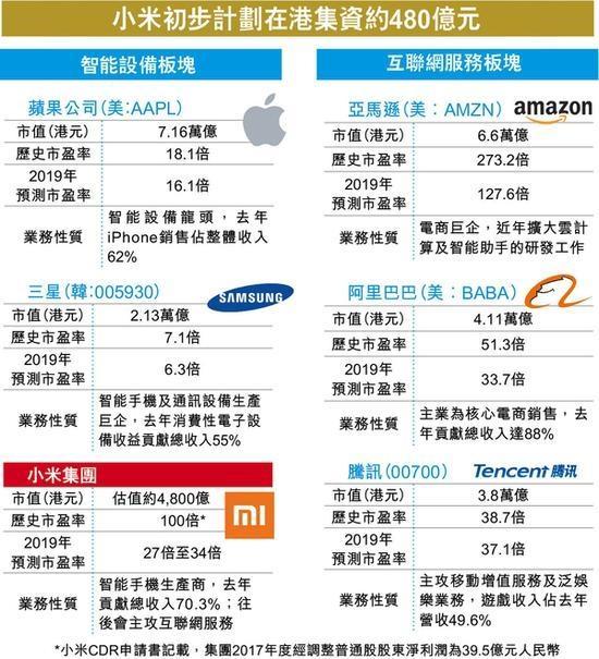 从之前小米CDR的数据来看,2017年全年经调整净利润为39.5亿元人民币,即约47.8亿港元,而小米今天的招股价的对应历史市盈率为77.5倍至100倍,这远高于苹果和三星的估值。
