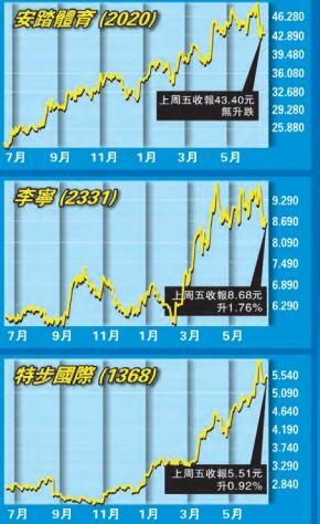 市場恐懼中美貿易戰硝烟再起,拖累港股上周累跌970點或3.2%,不少資金流入內需股避險,早前被沽空機構狙擊的體育用品股逆市向上。展望內地消費升級趨勢持續,市場憧憬世界盃熱潮進一步刺激體育用品銷售,體育用品股前景可看高一線,安踏體育(2020)、李寧(2331)及特步國際(1368)值得留意。香港商報記者 林德芬
