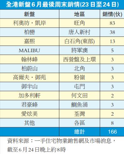 【香港商報网訊】記者曾浩榮報道:在一手空置稅措施公布前夕,新盤市場氣氛依然活躍,而且不少豪客現身!綜合一手銷售網及市場資料,6月最後周末(23日至24日),全港一手住宅市場共沽約166伙(截至昨晚約8時),略低於前周末約180伙水平。當中大額成交卻相對較多,新世界(017)元朗洋房新盤柏巒更「一口氣」賣出38間洋房,涉資金額或逾15億元,順利趕及在新措施前減少手上存貨。