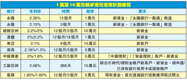 比較多間銀行1年期港元定存計劃,以永隆銀行最吸引和靈活,最低1萬元已可入場,年利率最高達到2.35%,須透過該行的手機應用程式「永隆銀行一點通」敘造,而且要求新資金。假設敘造最低1萬元定存,一年便可賺息235元。