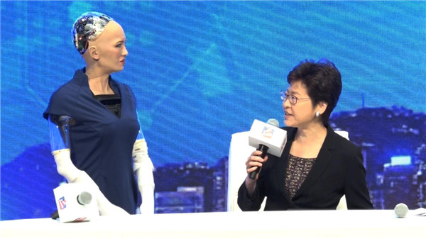論壇期間,林鄭月娥與人工智能機械人Sophia對話。林鄭月娥問Sophia如何看香港作為一個智慧城市,Sophia回答稱,對香港發展智慧城市感到自豪,形容香港在智慧城市的發展仍處於起步階段,預計未來會有更好的發展,并指自己作為一個土生土長的「香港人」,感到十分驕傲。林鄭月娥回應稱希望大家共同努力。