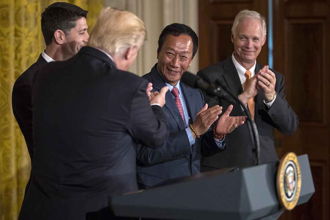 台媒称,去年7月,特朗普在一向用来接待外国元首的白宫东厅,为鸿海在美国投资8K电视机面板工厂召开记者会,欢迎郭台铭,这也是台资企业第一次受美国总统邀请,在白宫召开记者会。