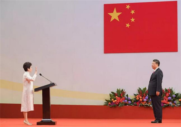 2017年7月1日上午,國家主席習近平在香港會議展覽中心舉行的香港特別行政區第五屆政府就職典禮上,為行政長官林鄭月娥監誓(圖:香港特區政府新聞處)