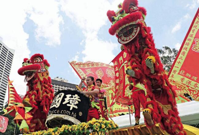 維園舉行龍獅匯演嘉年華,鑼鼓喧天。中新社