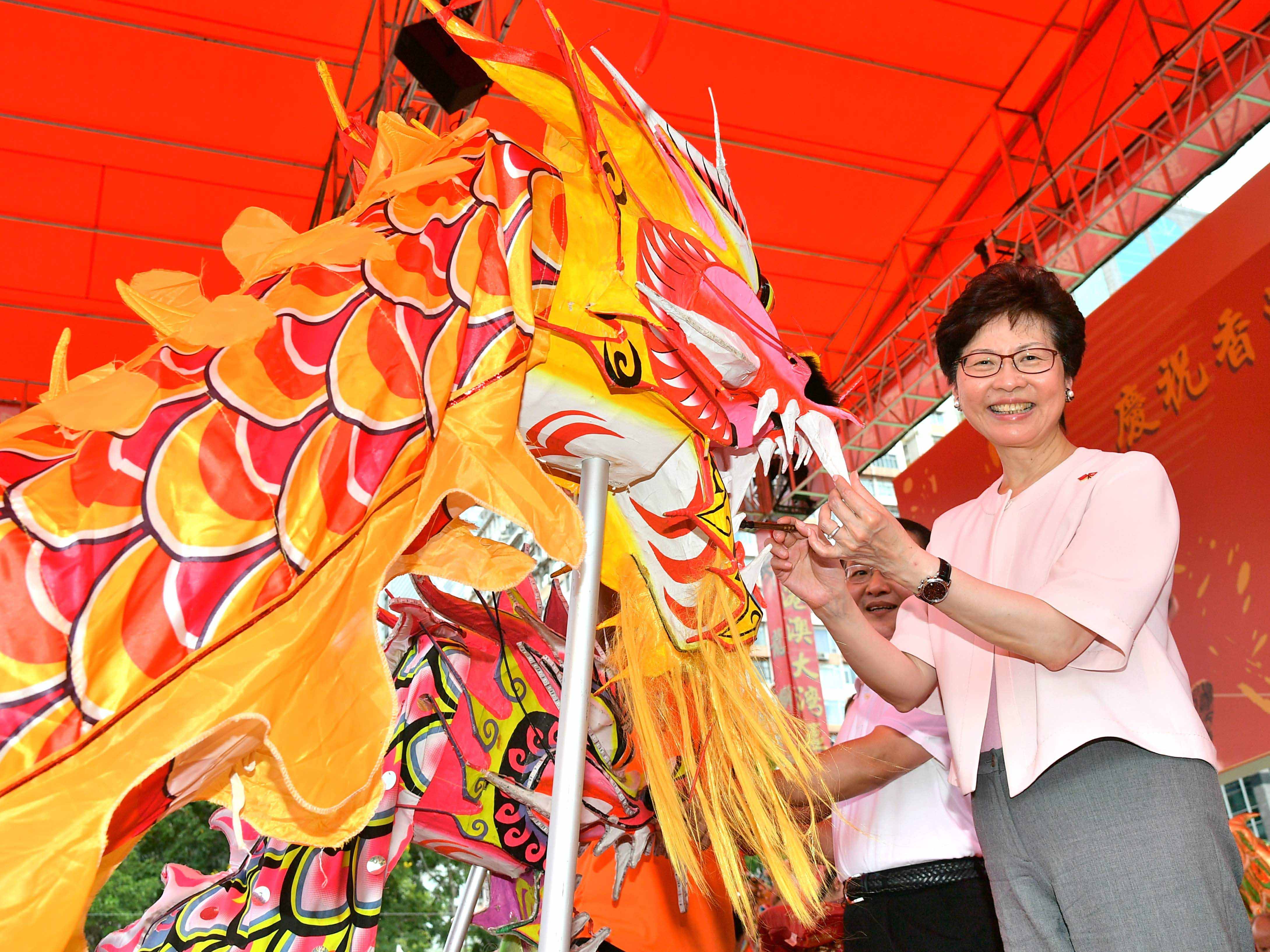 林郑月娥昨午在维多利亚公园出席香港各界庆典委员会主办的庆祝香港回归祖国21周年系列活动启动礼。图为林郑主持龙狮点睛仪式