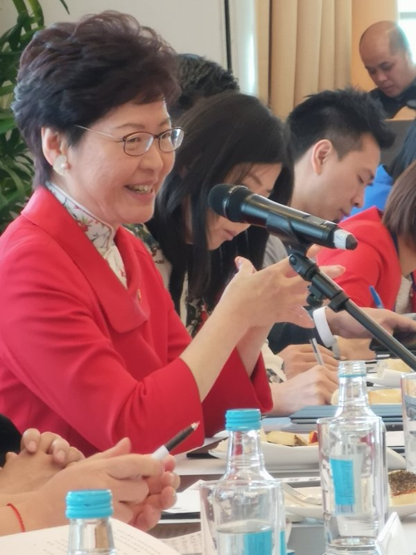 林郑月娥昨日於回归纪念日酒会后与传媒茶叙。 记者 刘晓东摄