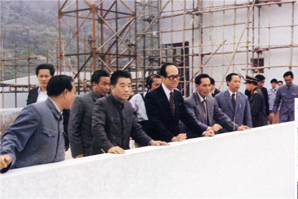 李嘉诚(前左三)1984年巡视汕大基建工地。