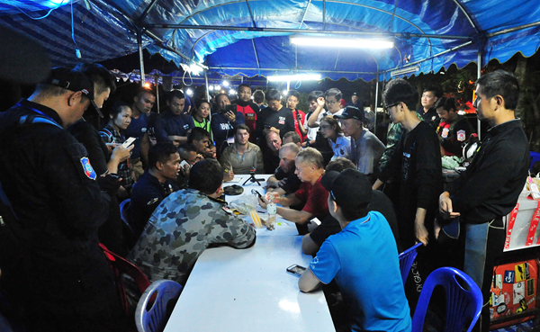 各國搜救隊員在受困者被困的山洞旁開會商討救援方案。 新華社