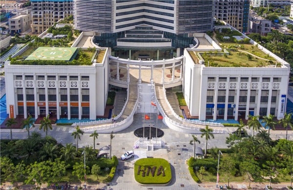 位于海口的海航集团总部大楼前,公司旗帜降半以悼念王健。