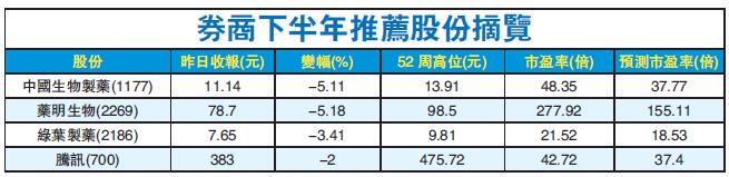 不過,洪灝指出,交銀國際繼續推介醫療保健、消費及公用事業等板塊。其中,醫藥板塊內,該行看好中國生物制藥(1177)、藥明生物(2269)及綠葉制藥(2186)。