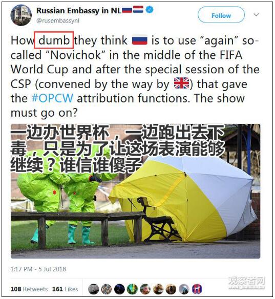对此,俄罗斯驻荷兰大使馆于今天(5日)在社交媒体上反驳,称“只有傻子才会相信,一边办着世界杯的俄罗斯会跑去给别人下毒。”