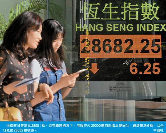【香港商報網訊】記者吳天淇報道:隔晚美股反彈帶動恒指高開212點後最高見28981點,惟騰訊(700)拖累之下,港股昨天29000關前遇阻反覆回吐,最終倒跌6點,以全日低位28682點收市。國企指數收報10824點,升56點。主板全日成交986億元。惟北水見低位撈貨,而近期焦點新股小米集團(1810)逆市造好,收報19元,較招股價升逾10%。