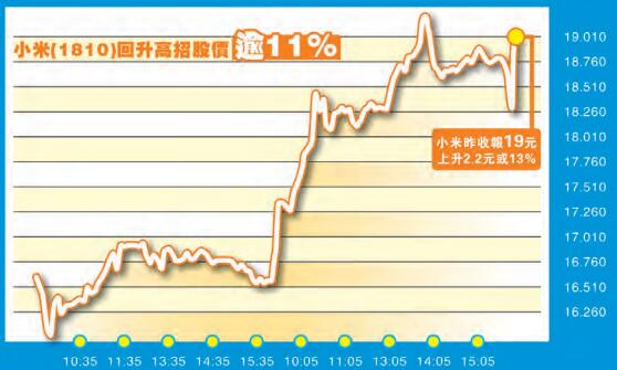 騰訊與小米昨天表現榮辱互見,騰訊成為跌市元兇,早段高見398元迅速倒跌,收報386.8元,跌2.3%,拖低恒指69點;小米甫開市即重上招股價,之後越升越有,曾飆逾15%,創19.34元新高;收市仍報19元,升13.1%。兩大最活躍港股,昨成交合共近202億元,佔大市成交逾20%。