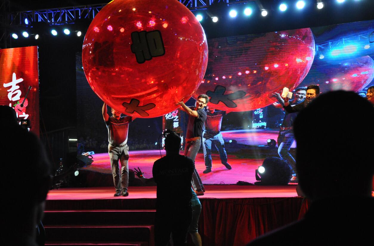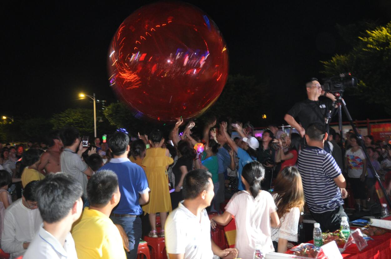 一颗寓意“大吉大利”的超级大“荔枝”气球在全场观众手中传递,气球滚动,欢笑声不止。