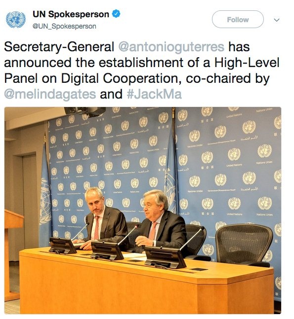7月12日,联合国秘书长古特雷斯宣布推出数字合作高级别小组,任命阿里巴巴集团董事局主席马云、比尔及梅琳达·盖茨基金会联合创始人梅琳达·盖茨为联合主席。该小组旨在通过跨领域和跨国界的合作,挖掘数字技术的社会和经济潜能,确保所有人都能受益于一个安全普惠的数字化未来。