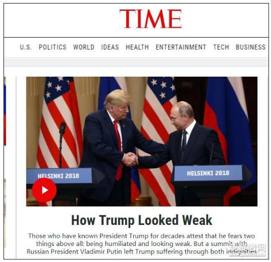 《时代周刊》网站则显得简洁明了,在其首页的最中心位置,一张特朗普与普京握手的照片,加上这样一个标题:“特朗普虚弱的样子。”