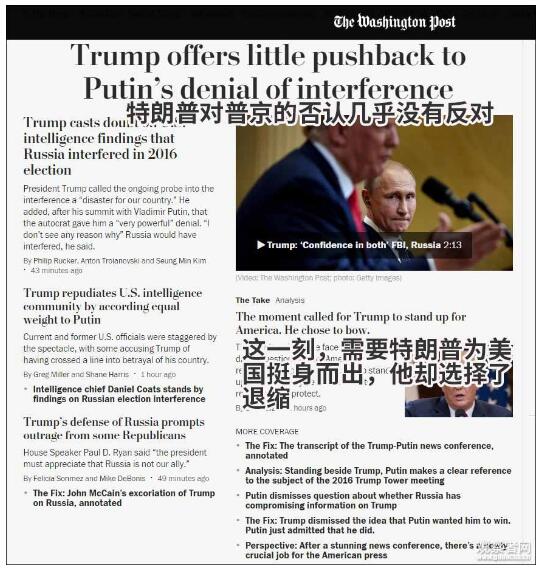 《华盛顿邮报》的头条与CNN的意思相近,都试图渲染特朗普对普京的支持态度:“这一刻,需要特朗普为美国挺身而出,他却选择了退缩”。