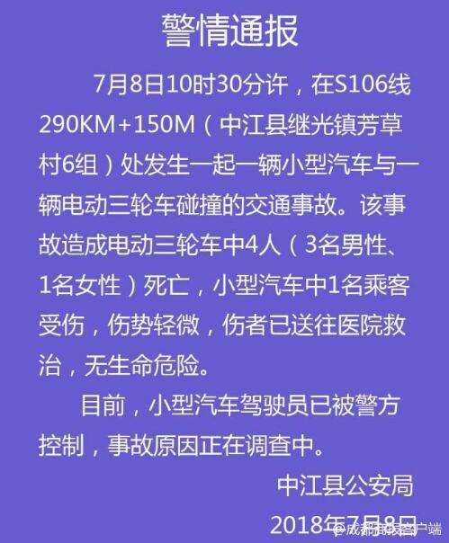 事情追溯到7月8日上午10点40分许,省道106线中江继光路段发生一起重大交通事故,一辆私家车与一辆机动三轮车迎面碰撞,造成三轮车上三男一女共4名老年人当场身亡,私家车上一男一女受轻伤。