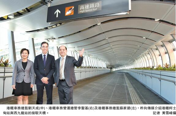 截至今年6月底,高鐵香港段項目整體已完成99.9%,西九龍站周邊主要道路及行人接駁設施工程已大致完成,當中包括7條行人天橋及2條行人隧道,將車站與本地交通網絡連接。港鐵車務營運總管(高速鐵路)李聖基介紹,透過相鄰的鐵路網絡,乘客只需少於15分鐘即可由西九龍站前往中環等商業區,乘客亦可在車站地面層及車站以北新建的巴士總站,轉乘其他公共交通工具。