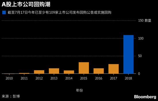 彭博汇总2010年以来的市场公开信息显示,截至7月17日年内发布回购公告或已实施回购的上市公司已有至少109家,在仅仅半年多的时间内,就创下了2010年以来年内预告或实施回购公司家数的新高。
