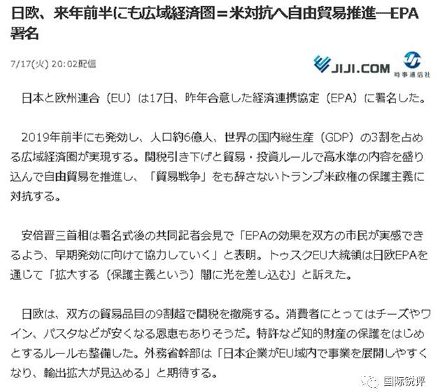 这一天,欧盟和日本签署了“经济伙伴关系协定”(EPA),这是迄今规模最大的自由贸易协定,预计将于今年内生效。协定一旦生效,将意味着人口规模达6亿、GDP占世界总量30%的全球最大规模的贸易开放区诞生。
