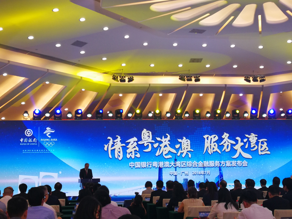 中国银行总行公司金融部总经理蒋昕介绍了此次中国银行为粤港澳大湾区量身订做的综合金融方案,中国银行将通过精心设计的“支付通”、“融资通”和“服务通”三大产品体系,以实际行动为粤港澳大湾区的互联互通、转型升级、科技创新、国际合作和民生福祉提供金融支持。