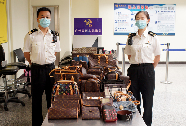 广州天河车站海关在进境旅检渠道查获旅客违规携带大量名牌挎包入境--巢家敏摄