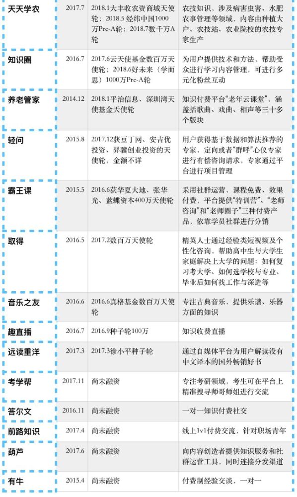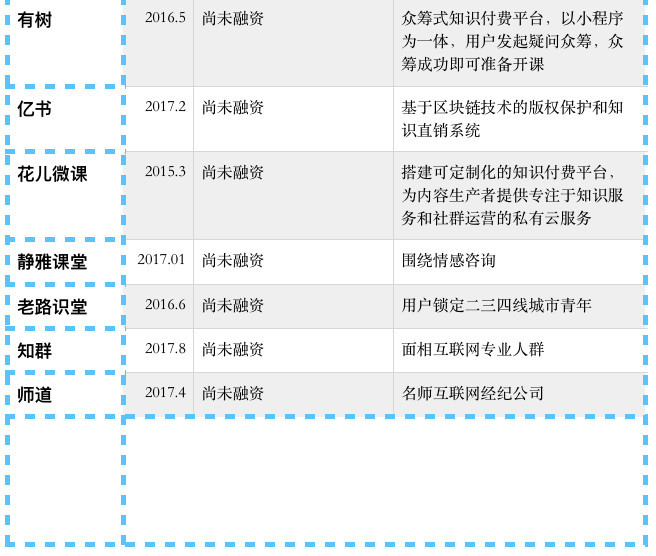 最后,我们梳理了知识付费行业的创业项目,并简要说明了它们各自的亮点,供投资人、创业者参考。