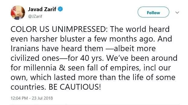 报道称,扎里夫是针对特朗普7月22日的“推文”作出回应的,特朗普发布一条全部大写的“推文”警告说:“永远别再威胁美国,否则你会承担历史上没几个人遭遇过的后果。”