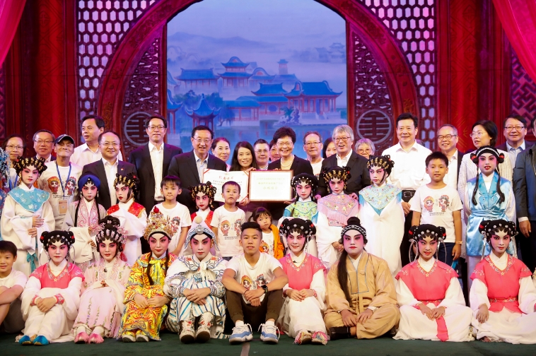 香港特區行政長官林鄭月娥、文化和旅遊部部長雒樹剛、國務院港澳事務辦公室主任張曉明、中央政府駐港聯絡辦主任王志民、香港特區政府民政事務局局長劉江華等在北京觀看了來自香港的聲輝粵劇推廣協會的青年藝術家們的表演。圖為一眾於台上大合照。中新社
