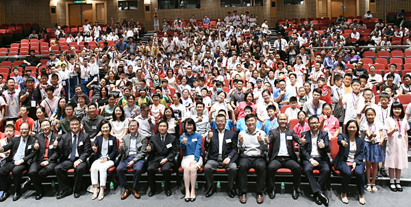 內地港澳青少年STEAM創客比賽舉行頒獎禮,嘉賓與學生合照。 記者 馮瀚文攝