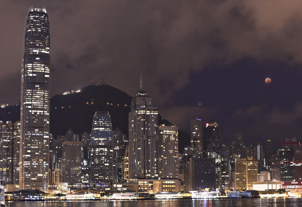 凌晨維港上空看到月全食及「火星大衝」(月亮左斜下光點為火星)2個罕見天文現象。