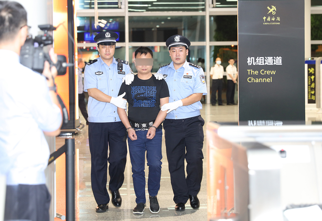 潜逃十年的“红通”嫌疑人王某被海关缉私警察押解通过广州白云机场入境。