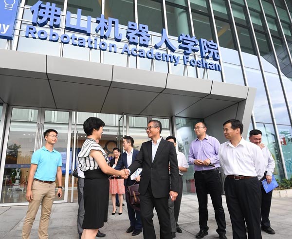 財政司司長陳茂波(前排左二)參觀佛山機器人學院,門外與學院代表握手。