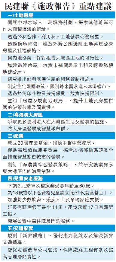 民建聯提出的建議針對土地房屋為重點,當中包括:開展中部水域人工島填海計劃,並探索其他離岸可作大面積填海的選址;建立高透明度及具公信力的機制,透過公私合作,利用私人土地發展公營房屋;透過換地補償,釋放1%至2%郊野公園邊陲土地興建公營房屋及社福設施;與內地協商,探討租借大灣區土地的可行性,以增加香港可發展空間的選擇。