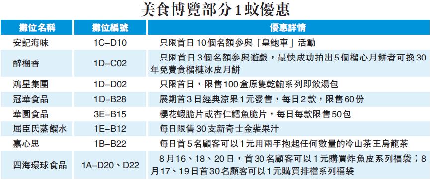 每年美食博覽都會有不少展商推出1蚊優惠,今年亦不例外,當中不少更是新加入戰團。安記海味推出1蚊「皇鮑車」,首日入場的首10名顧客將分成兩隊,各有5人,兩隊各派一迷你行李篋,每篋可以容納16盒、總值達5000元的鮑魚,將鮑魚盒入填滿行李篋後,雙方要進行推篋比賽,將行李篋推得最接近寫有「安記」地上圓圈的一方獲勝,可獲價值1萬元的四頭、八頭盒裝鮑魚。人稱「輝哥」的安記董事總經理潘權輝說,年年都推出1蚊優惠,希望與大家有更多互動,並回饋排隊入場的忠實擁躉,他預計今年展期整體銷售額有約一成增長。