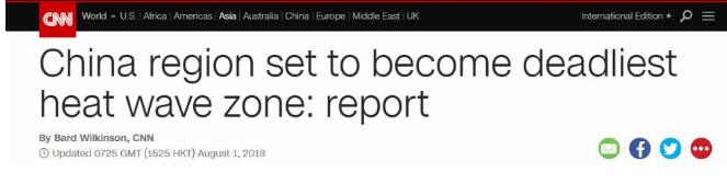 最新研究报告显示,除非二氧化碳排放显著降低,否则在本世界末,具体说是在2070年前,气候变化产生的巨大潮湿热浪有可能改变人类宜居区域的边界,使中国北方平原变成“全世界最致命的热浪区”。