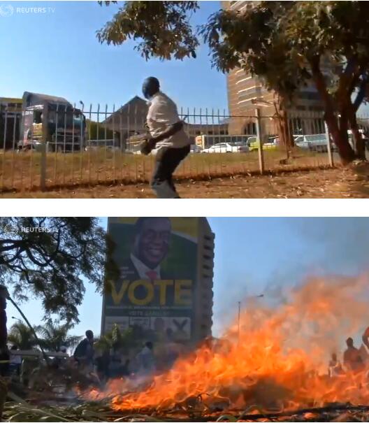反对派支持者在哈拉雷的市中心抗议示威,有人利用金属棍棒和石头,摧毁街道上的红绿灯、店面等。有人焚烧杂物和车胎,并向警方丢掷石头。
