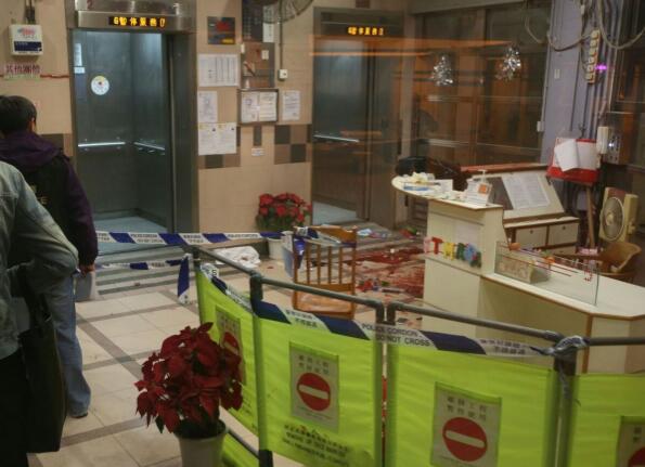 兇案發生後,電梯大堂遺下血漬。資料圖片