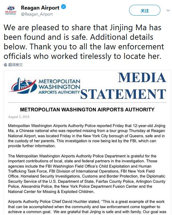 【环球网报道记者 赵建东】“我们很高兴地告诉大家,马金晶(Jinjing Ma,音译)已经被找到,并且是安全的。”当地时间3日,美国华盛顿里根机场官方推特发表声明称,此前被报道疑似遭到绑架的12岁中国女孩马金晶(Jinjing Ma,音译)已被找到,确认安全,目前与她的亲生父母在纽约。声明同时感谢相关部门的协助和努力。
