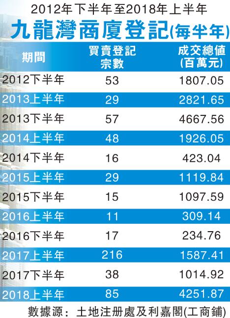 今年九龍灣商廈成交更趨活躍,根據利嘉閣地產數據,單是今年上半年,區內已錄85宗成交,遠比去年下半年的38宗為多,亦為2012年起動東九龍辦公室成交以來,僅次於2017年上半年的216宗成交的高水平。值得一提的是,2017年上半年九龍灣商廈成交宗數之所以那麼高,主要是因為恒地(012)把旗下工廈巨昇中心翻新活化為寫字樓,並易名為創豪坊,其後分拆出售逾150伙,帶動區內商廈的成交。
