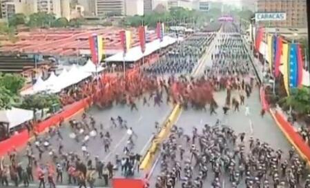 从当地电视片段可见,马杜罗演说到中途,画面突然震动,他抬头往上望,神色慌张,旁边的夫人也惊慌起来。镜头即时切换到外面的国民警卫军方阵,但画面右边不久出现骚动,大批士兵即场逃走,画面也中断。