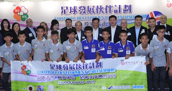 由北京足總、香港足總及冰島足總聯合舉辦的「足球發展伙伴計劃」昨日舉行授旗儀式。張建宗、中聯辦副主任陳冬及外交部駐港公署副特派員宋如安擔任主禮嘉賓。