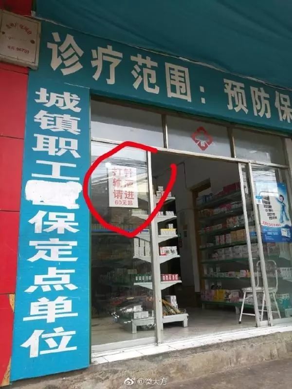 贵州网友@微大方 7月30日反映,毕节市纳雍县人民医院附近一卫生室玻璃门上,挂有“打针输液请进60元起”字样贴纸,因涉强制“最低消费”引起热议。