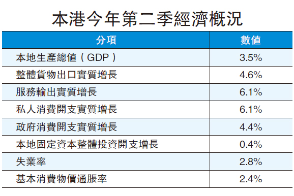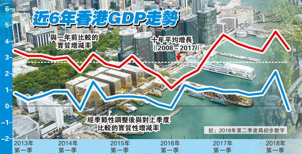 特區政府昨日發表《2018年半年經濟報告》和今年第二季度的本地生產總值初步數字。基於全球經濟蓬勃,外部需求持續強勁,本港GDP按年升3.5%,但報告顯示臨近6月份後期情況有所放緩。經季節性調整後,實質本地生產總值在第一季急升2.1%後,在基數偏高情況下,第二季錄得0.2%的輕微跌幅。梁永勝表示,這是香港經濟增速連續第七個季度高於過去十年平均2.7%的趨勢增長率,表明經濟運行延續強勁態勢。