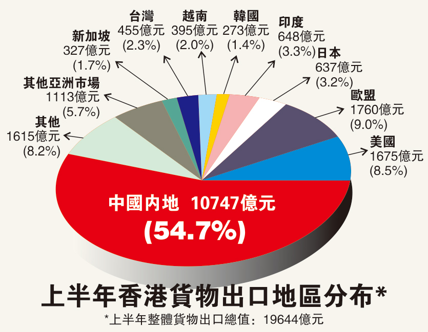 另外,中國於8月3日公布反制關稅措施清單中,影響經香港轉口到內地的美國產品總值為512億元,佔香港整體貨物出口總值的1.3%,佔美國經香港轉口至內地的產品總值的70%。